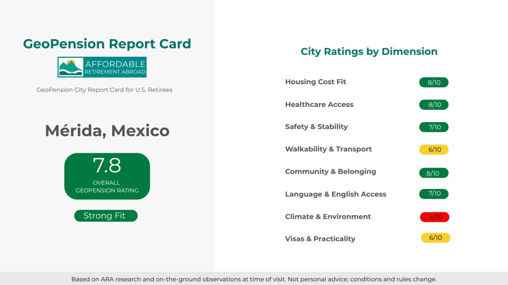 GeoPension ratings and city profiles are based on research and on-the-ground observations at a point in time. This is not individualized financial/legal/medical advice, and costs, safety, and visa rules can change.